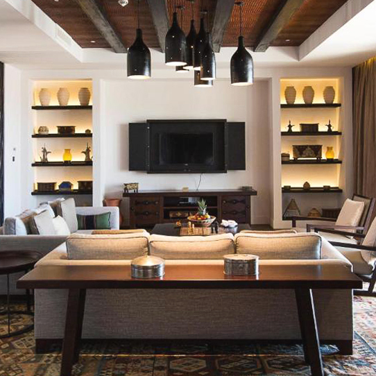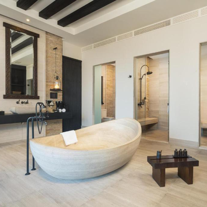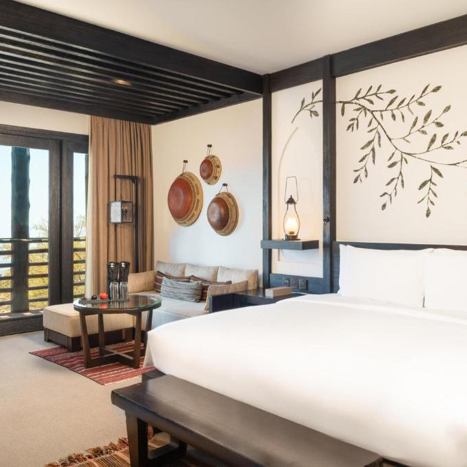 L’hôtel propose des suites, parfois réparties sur deux niveaux et des villas exclusives conçues comme un sanctuaire privé. La décoration marie des tons neutres, textiles et touches de design omanais.