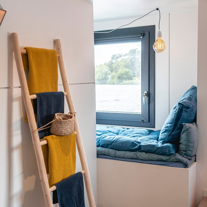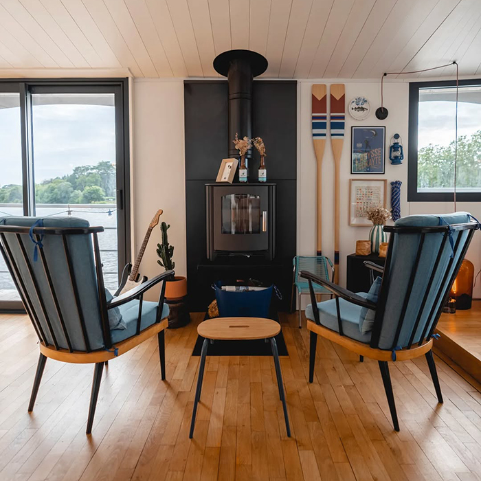 Pour commencer, dès qu’on embarque sur la péniche, on pénètre dans un havre de paix, de déconnexion et de nature. L’atmosphère est chaleureuse et poétique avec cette lumière unique qui se reflète sur l’Erdre au coucher et au lever du soleil. On sent immédiatement qu’on entre dans un lieu atypique et apaisant, où chaque détail a été pensé pour créer une parenthèse de slow living hors du temps !