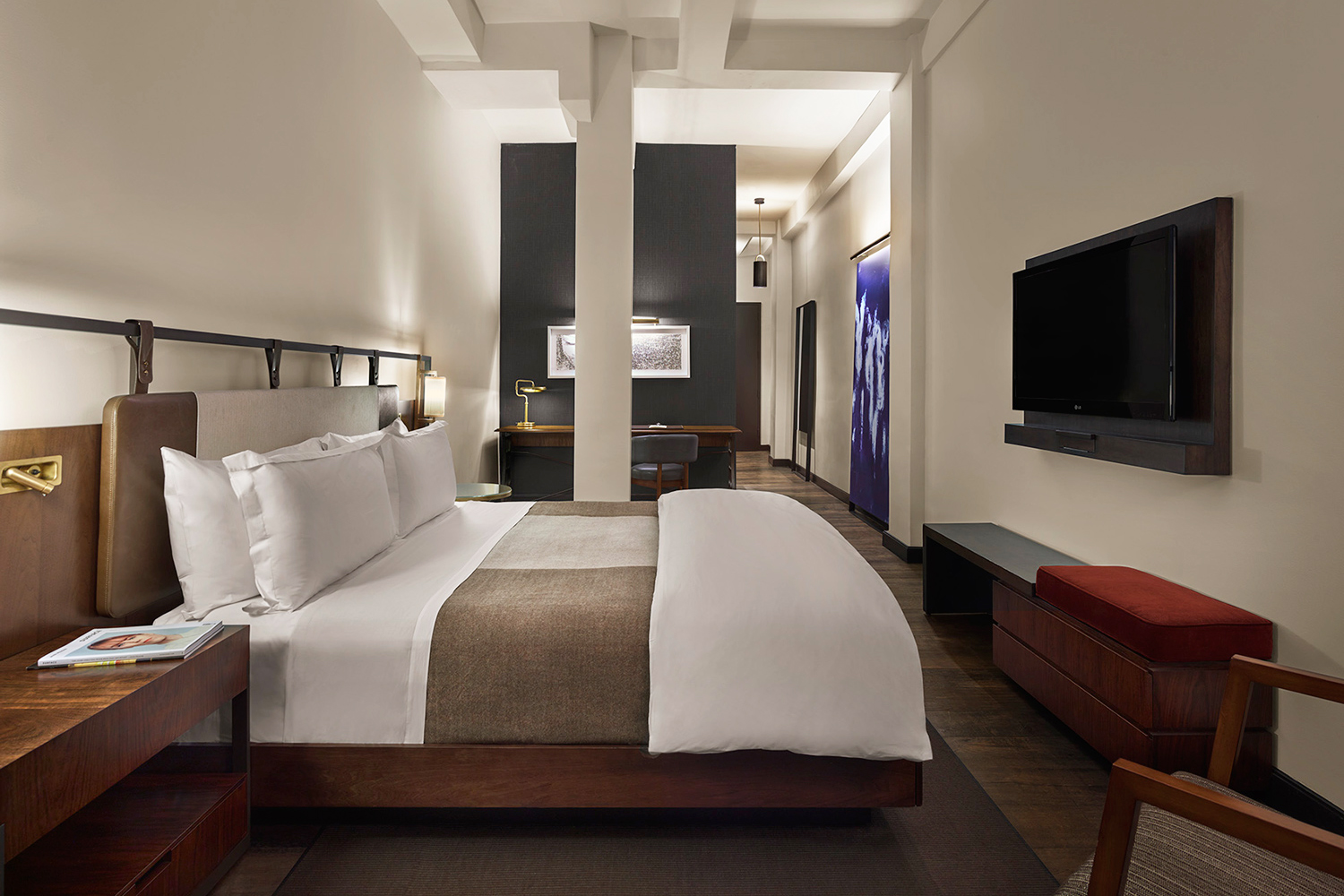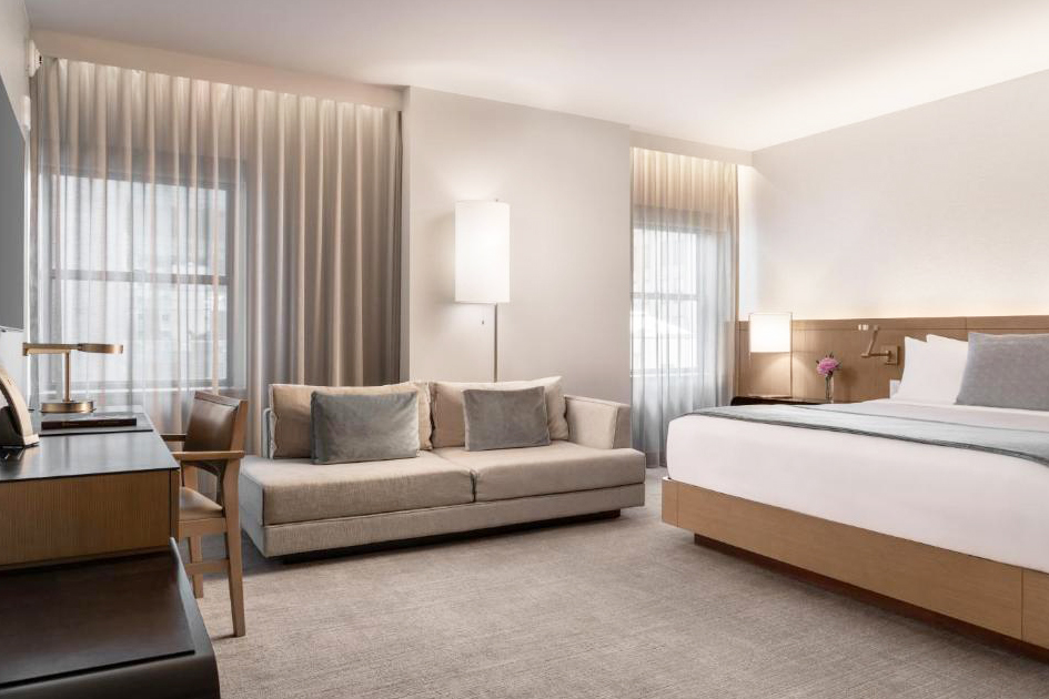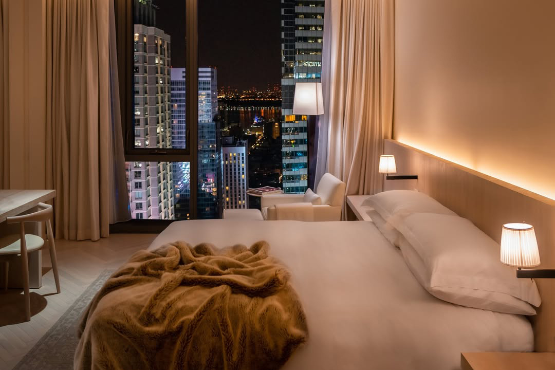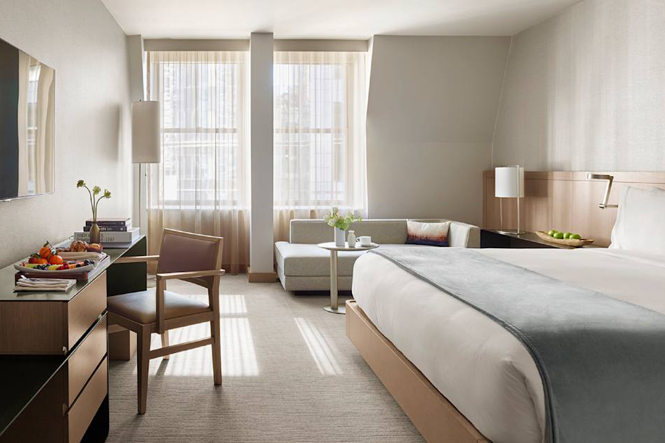 Tandis que, le design de ses chambres, conçu par Wimberly Interiors et Mancini Duffy est un décor élégant aux tons chauds ouvert sur le panorama grandiose de New York et sur la skyline de Manhattan.